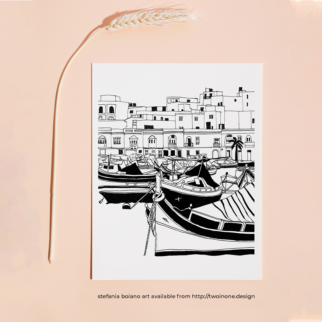 Professional Fine Art Print of Ink Hand drawing of the Marsaxlokk Bay in Malta, by Stefania Boiano. It looks exactly the same as the original.